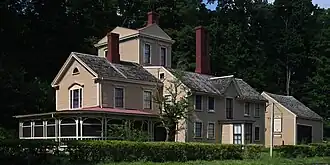 After living for a time in a rented home in Lenox, Massachusetts, author Nathaniel Hawthorne considered purchasing a home for his family. He assured his wife Sophia Peabody that his publishers Ticknor & Fields "promise the most liberal advances of money, should we need it, towards buying the house."[16] On March 8, 1852, Hawthorne finalized his purchase of the house for $1,500 from the Alcotts.[17] After buying the house, Hawthorne wrote, "Mr Alcott... had wasted a good deal of money in fitting it up to suit his own taste—all of which improvements I get for little or nothing. Having been much neglected, the place is the raggedest in the world but it will make, sooner or later, a comfortable and sufficiently pleasant home."[18] The Hawthornes had previously lived in Concord at The Old Manse, which they moved to after their July 9, 1842, wedding.[19] Their new home was about two miles from there[17] and the couple moved in with their three children in June. Nathaniel renamed it "The Wayside",[20] noting that it stood so close to the road that it could have been mistaken for a coach stop.[21] He explained in a letter: "I think [it] a better name, and more morally suggestive than that which... Mr. Alcott... bestowed on it."[22] Bronson never accepted the name change and continued referring to it as "Hillside".[23] Some time in 1852, the Hawthornes hired Henry David Thoreau to survey the property. The young six-year old Julian Hawthorne, the second of the Hawthornes' three children, accompanied him in silence. Thoreau remarked to the boys father he was a "good boy! Sharp eyes, and no tongue".[24] By October 1852, Hawthorne wrote to his friend Henry Wadsworth Longfellow, "I am beginning to take root here, and feel myself, for the first time in my life, really at home."[25]