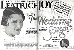 The Wedding Song is a 1925 American silent drama film directed by Alan Hale and starred Leatrice Joy, Robert Ames, and Charles K. Gerrard.[1] It is based upon the novel of the same name by Ethel Watts Mumford.[2]