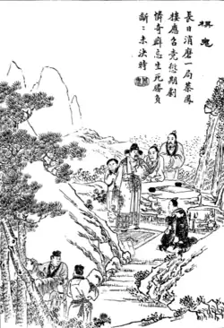 A General Liang is enjoying a public holiday at his residence. Halfway into his game of weiqi with a peer, a dishevelled-looking passer-by appears and begins observing the game intently.[1] Courteous but aloof, the stranger initially declines the general's game request but ultimately gives in, only to lose.[2] At this point the stranger has become immersed in the game, and he continues to playing with the general and his mates.[2]