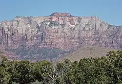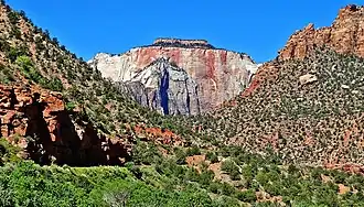 The West Temple is a prominent 7,810-foot (2,380 m) mountain summit composed of Navajo Sandstone in Zion National Park in Washington County of Utah, United States. The West Temple, the highest feature in Zion Canyon, was originally called "Temp-o-i-tin-car-ur", meaning "Mountain Without a Trail" by the Paiute people.[4] It was called "Steamboat Mountain" by local Mormon settlers before 1934, when the USGS officially changed it to its present name, which was applied by John Wesley Powell during his explorations in 1872.[5] West Temple is situated two miles northwest of Springdale, Utah, one mile northeast of Mount Kinesava, and two miles west of the park headquarters. It is one of the notable landmarks in the park. The nearest higher peak is Windy Peak, 10.46 miles (16.83 km) to the north.[1] Precipitation runoff from the mountain drains into tributaries of the Virgin River.