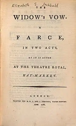 The Widow's Vow is a 1786 comedy play by the English writer Elizabeth Inchbald.[1] A farce, it premiered as an afterpiece at the Theatre Royal, Haymarket on 20 June 1786.[2] The original cast included William Parsons as Don Antonio, John Bannister as Marquis, Robert Palmer as Carlos, John Edwin as Jerome and Mary Wells as Flora. The playwright Thomas Holcroft wrote the prologue.