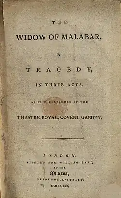 The Widow of Malabar is a 1790 tragedy by the British writer Mariana Starke.[1] It premiered at the Theatre Royal, Covent Garden on 5 May 1790.[2] The original cast included William Farren as Raymond, George Davies Harley as Chief Bramin, William Powell as Second Bramin, Joseph George Holman as Young Bramin, James Thompson as Narrain, Ann Brunton Merry as Indamora and Mrs Rock as Fatima.