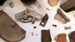 Excavations of the kilns yielded thousands of artifacts including 16,000 salt- and alkaline-glazed shards: lids, lids with knobs, handles, rims, and jug tops; maker's stamps; kiln furniture; six pieces of a one quart jar; one whole jar; and one clay marble, as well as some glass and other miscellaneous non-ceramic items.[1]