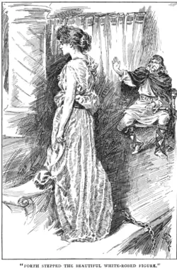 Meanwhile, the boy-prince's wet nurse was about to witness the supernatural appearance of the true queen. When the wet nurse turned the [candle-]light on,[e] several planks from the floor rose up, and from underneath appeared an astonishingly beautiful white-clad woman, dressed in linen.[f] Clasped around her waist was an iron belt, with a chain leading down into the ground below. The queen embraced the child for a moment, and returned under the floor again. Her appearance was repeated the second night, and the nurse heard the queen say lamentfully that "Two are gone, and one only is left," which the nurse guessed must mean that the third night would be her final appearance.