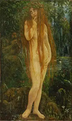 Sibelius admired Rydberg and often set his poetry to music, including the melodrama Snöfrid, Op. 29, and the War Song of Tyrtaeus.[6][7][8] The poem Skogsrået was first published in 1882, and in 1883 Sibelius's future friend, the artist Akseli Gallen-Kallela, illustrated it. In 1888 or 1889, about the time the two met, Sibelius first set Skogsrået for voice and piano. This setting is musically unrelated to Sibelius's 1894–95 treatment.[b][10][3]
