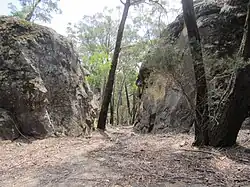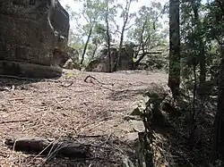 A section of the original The Wool Road from Nerriga that passed through the Bulee Gap cutting was bypassed by the 1856 route but it remained in use as an alternative stock route to the corresponding part to the newer Braidwood Road. During the Second World War, a part of this section of the original road was deliberately destroyed using explosives, to limit access by an enemy to the inland area and the national capital, Canberra.[106]
