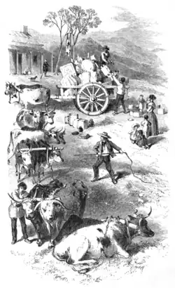 Transporting the wool bales using the cumbersome bullock drays of the time involved a long and arduous journey from Braidwood—taking around three weeks at the bullocks' slow pace and with their need to stop for rest, feeding and watering—via Bungonia and Marulan to Sydney. The owner of Yarralumla, Terence Murray, further away at the Limestone Plains, complained that, in wet weather, the drays could take as long as three months to reach Sydney.[9] From the early 1830s, there was agitation for a shorter route to the sea.[10][11]