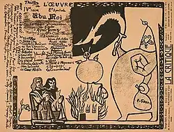On December 10, 1896, the Théâtre de l'Œuvre presented Alfred Jarry's soon legendary Ubu Roi, at Nouveau-Théâtre, 15, rue Blanche, with actor Firmin Gémier in the title role. Jarry had finished this epochal play about human greed, cowardice, and stupidity just six months before it would shock the audiences with its unapologetic opening line, "Merdre" and its playfully theatrical, marionette-like performance style. Though Jarry affected an attitude of political indifference, his revolutionary ideas challenged assumptions about society, propriety, and existence. Brockett notes that "Ubu Roi shows in all its grotesqueness a world without human decency."[4] In this lithograph announcement by Jarry for the premiere of Ubu Roi, the obese, tyrannical King Ubu appears as a shadow puppet with a segmented arm. He brandishes a scimitar in one hand and clutches a sack of gold in the other.