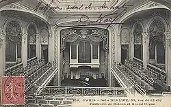 According to the present theatre's Web site, at some point in the nineteenth century, the Duke of Gramont built a rudimentary little theatre on this property, where he had also installed his mistress, opera singer Mademoiselle Coupé. Reputedly, the theatre privately offered a repertory that included risqué, even salacious work. In 1892, the space was renovated as a public concert hall with entrance in the adjoining courtyard area of Cité Monthiers. The hall, which featured orchestra level and three-sided balcony seating, as well as a large upstage organ, was named Salle Berlioz in honor of French composer, conductor, and music critic Hector Berlioz (1803-1869), who had lived nearby on the rue de Calais.[1]