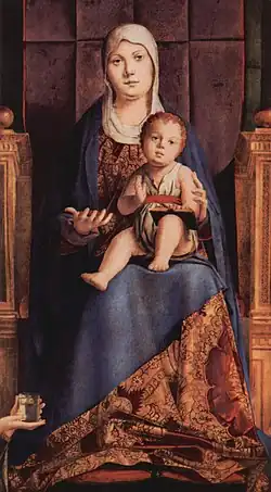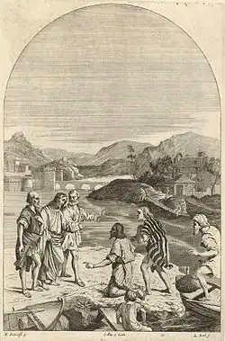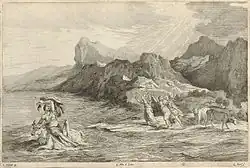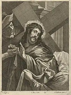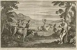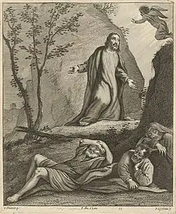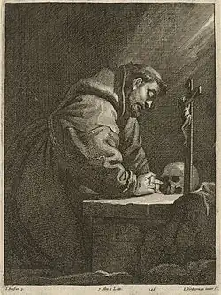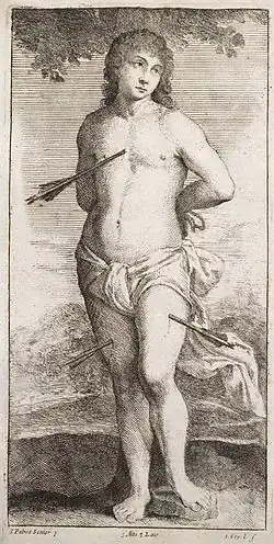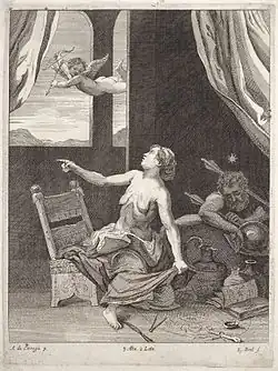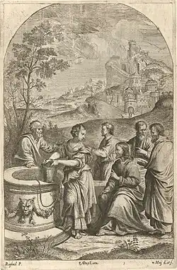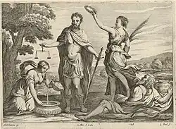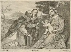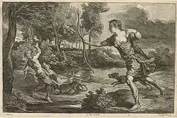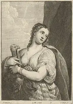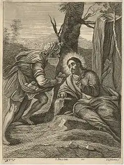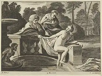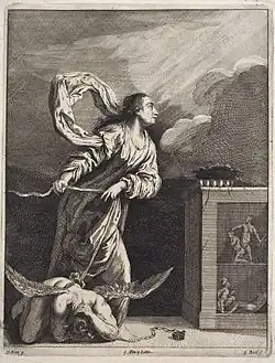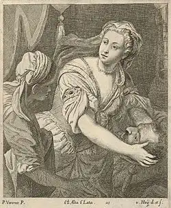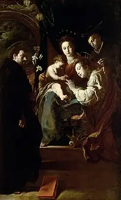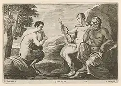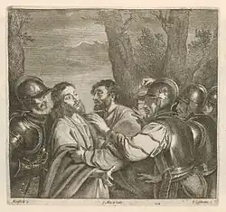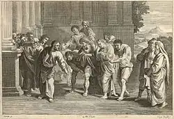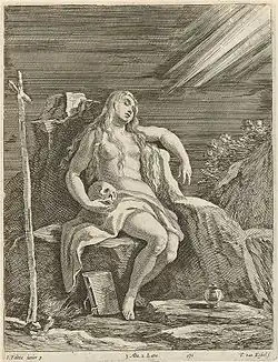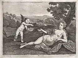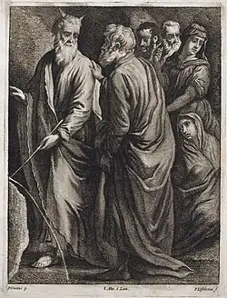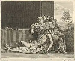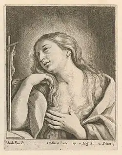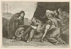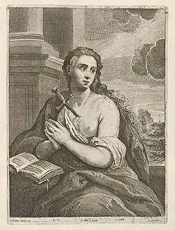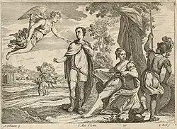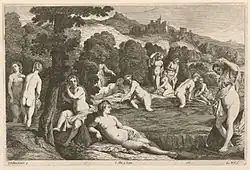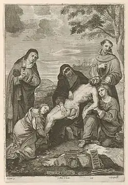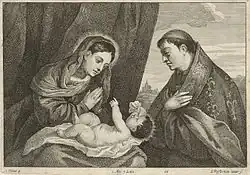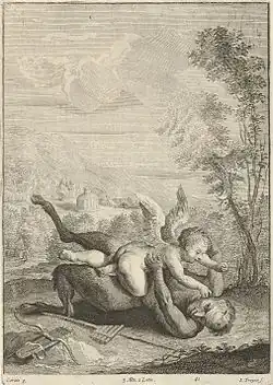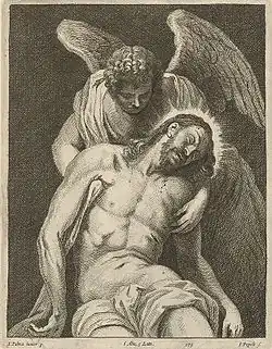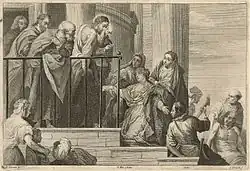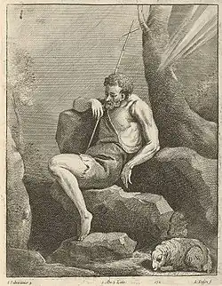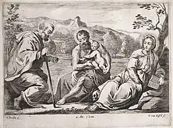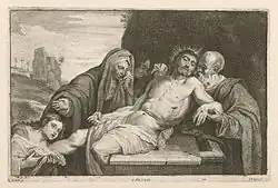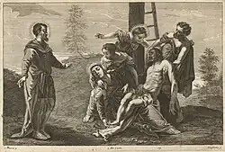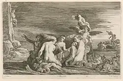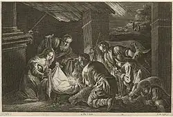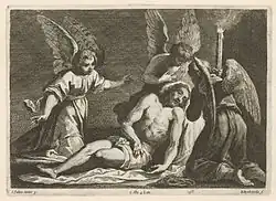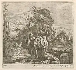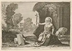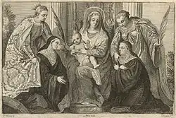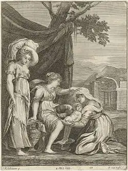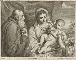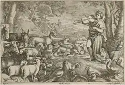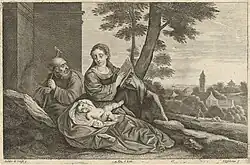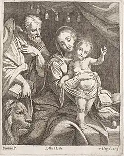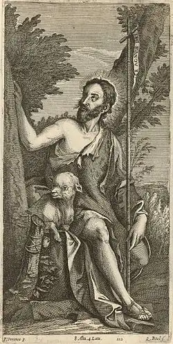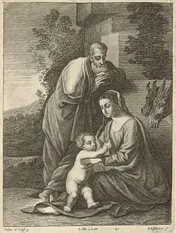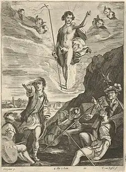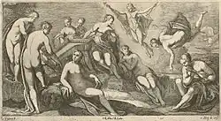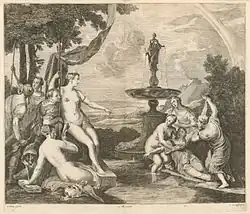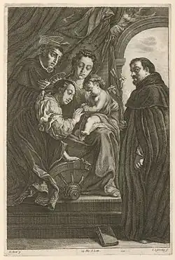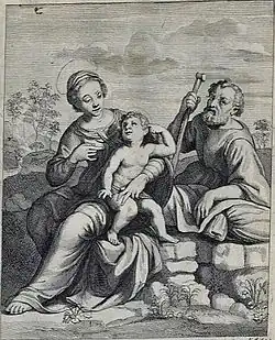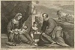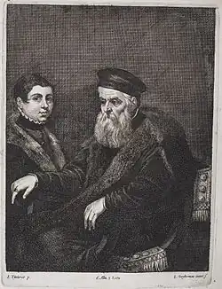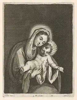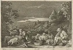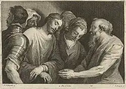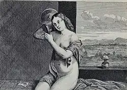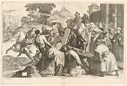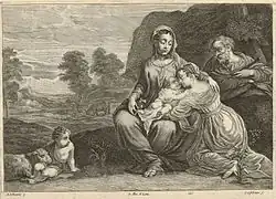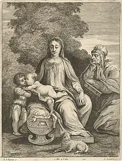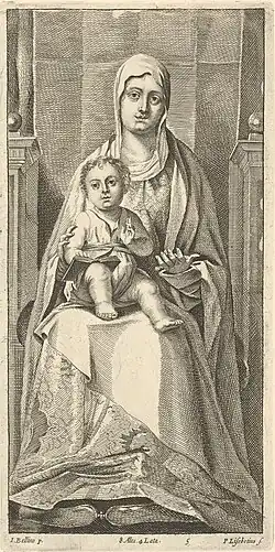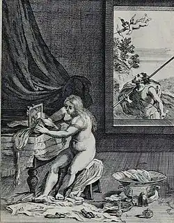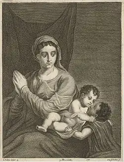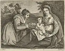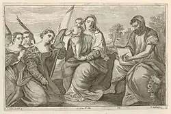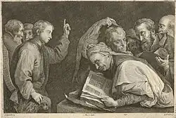 Teniers used full colour in the modelli, rather than grisaille. This could mean that he intended these reproductions to function as independent records of some of these Italian paintings in the Archduke's collection. From the many modelli, which have been preserved, it is obvious that Teniers's copies constitute a true record of the originals even while he left out details and painted them in his typical fluid and transparent manner. The engraving of the catalog by engravers who worked after the modelli, not the originals, was started by 1656.[5] In the 17th century there existed no efficient method for inverting images. As a result, most of the prints in the catalog are reverse images of the originals.[6] Each print gives the name of the author of the original work on the left hand side (indicated by the letter 'p' for 'pinxit', Latin for 'painted by') and the engraver of the print on the right hand side (indicated by the letter 's' for 'sculpsit', Latin for 'engraved by'). Some editions also indicated the original dimensions of the paintings.[7]