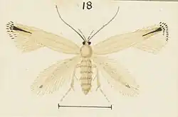 ♀ 14 mm. Head, thorax ochreous-whitish (rubbed). Palpi whitish. Forewings lanceolate, apex acutely produced, caudulate; ochreous-whitish; a fine dark grey line from disc at 45 to apex, terminating in a black apical dot: cilia ochreous-whitish, round apex short segments of blackish subbasal and grey postmedian lines. Hind-wings pale grey; cilia whitish.[2]