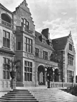 The castle was built in the 19th century by Victoria, Princess Royal, daughter of Queen Victoria. She had modelled it after Balmoral Castle in Aberdeenshire, Scotland.[6] Prior to its occupation by American forces in 1945 and spurred on by the worsening bombardment of the Frankfurt area – where large portions of their valuables had been stored in various banks – they decided to hide their most valuable possessions including tiaras, necklaces and bracelets encrusted with valuable gems, gold cutlery, family bibles and snuff boxes in Schloss Friedrichshof.[1][2] In all, the valuables were estimated to be worth over $2.5 million at the time, or $36 million in 2021.[a][2][9] They were individually packaged and inventoried before being placed in a zinc-lined and waterproof wooden box.[1][10] On the evening of October 31, 1944,[10] They buried the box in the basement, covering the spot with cement and installing a false wall.[1]