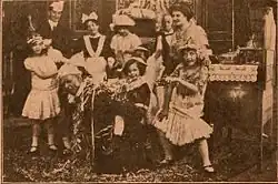 The writer of the scenario is unknown, but it was most likely Lloyd Lonergan. He was an experienced newspaperman employed by The New York Evening World while writing scripts for the Thanhouser productions.[2] The film director is unknown, but it may have been Barry O'Neil. Film historian Q. David Bowers does not attribute a cameraman for this production, but at least two possible candidates exist. Blair Smith was the first cameraman of the Thanhouser company, but he was soon joined by Carl Louis Gregory who had years of experience as a still and motion picture photographer. The role of the cameraman was uncredited in 1910 productions.[3] The only known credit is for Marie Eline in the role of "their child".[1] The other cast credits are unknown, but many 1910 Thanhouser productions are fragmentary.[4] In late 1910, the Thanhouser company released a list of the important personalities in their films. The list includes G.W. Abbe, Justus D. Barnes, Frank H. Crane, Irene Crane, Marie Eline, Violet Heming, Martin J. Faust, Thomas Fortune, George Middleton, Grace Moore, John W. Noble, Anna Rosemond, Mrs. George Walters.[5] A surviving film still gives the possibility of identifying most of the actors in the film.[6]