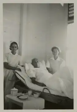 When they arrived in Jodensavanne, internees were immediately put to work in hard labour in a "green hell", denied medication for dysentery, and subjected to degrading hazing tactics, despite not having been charged with any crime.[43][41][44] The prisoners were considered traitors for their support for the NSB and Nazi Germany, and therefore the guards treated them mercilessly. The first camp commander, Gebuys, was later said to have told prisoners that they would only be sent to hospital if they died.[45] They were regularly beaten with clubs or had their hands and feet shackled together; two went on hunger strike and died as a result, while others were tortured and killed by guards after an escape attempt.[39][46][47] Becking became quite sick under these conditions, and Schoonheyt, his former Digoel colleague, tried his best to treat him.[29]
