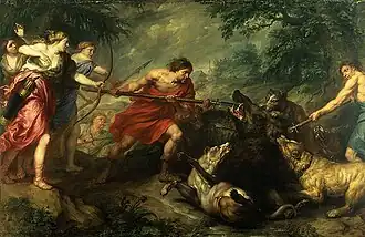 One of his last works represents The Hunt of the Calydonian Boar (1677, Musée de la chasse et de la nature, Paris) and is inspired by Rubens' treatment of the same subject (Kunsthistorisches Museum). The scene depicted centers on the killing of the boar by the hunters and hounds. While clearly inspired by Rubens, Boeyermans' originality is manifested in his simpler and more intense treatment compared to Rubens' violent whirlwind of people and animals. Boeyermans used in his composition a free and delicate technique but tightened his brush stroke in the details that contribute most to the understanding of the scene, i.e. in the faces of the hunters.[8]