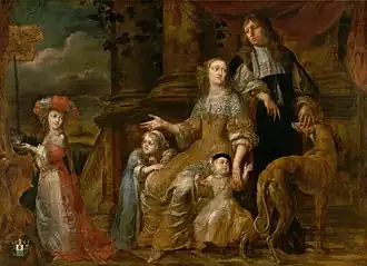 In his portraits, the refined treatment of his subjects shows the influence of van Dyck's portraits. An example is the family portrait of the de Bie family (Royal Museum of Fine Arts, Antwerp), which depicts the well-to-do de Bie family of Antwerp amidst the usual symbols of fidelity (the dog), fortitude (the columns), fertility (the vines) and love (the fire).[9]