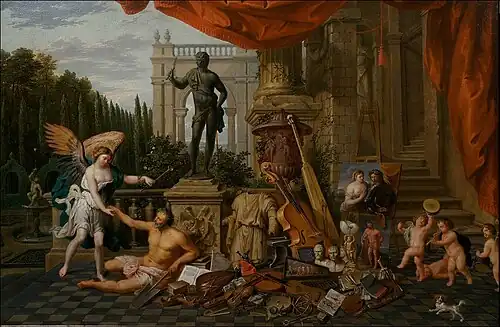 One of his allegorical paintings called Antwerp, Nourishing the Painters (1665, Royal Museum of Fine Arts, Antwerp) is a tribute to the artistic history of Antwerp and was executed for the meeting hall of the Antwerp Academy, which had been founded shortly before in 1663 at the initiative of David Teniers the Younger. The painting was intended as ceiling decoration of the meeting hall of the academy for which Jacob Jordaens also donated two other ceiling paintings. Boeyermans' allegorical painting celebrates Anwerp's glorious artistic past. This past is represented by means of the portraits of Peter Paul Rubens and Anthony van Dyck, who watch over young students practising the arts. In the center is an allegorical female figure who represents the city of Antwerp and was according to some a portrait of van Dyck's wife Mary Ruthven. Chronos (Time) accompanies young students who present their artwork, while the river god Scaldis (a symbol of Antwerp's river Scheldt) with his cornucopia, symbolizes the wealth and bounty of the city's artistic heritage. A bust of Homer emphasizes the close link between Pictura (painting) and Poesis (poetry).[7] In the 1660s Boeyermans produced another allegorical painting of Antwerp referred to as Allegory of the City of Antwerp (private collection).[2]