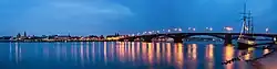 The Theodor Heuss Bridge is an arch bridge over the Rhine River connecting the Mainz-Kastel district of Wiesbaden, capital of state Hesse and the Rhineland-Palatinate state capital Mainz. The main span of the bridge is 102.94 meters (337.7 ft) long. It connects the Bundesstraßes 40 and 455. Initially it was just called “Straßenbrücke” (street bridge), later it was named after German statesman Theodor Heuss.