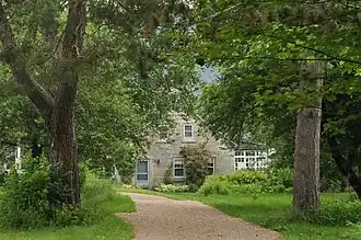 The Jellison House stands on the south bank of the St. Croix River, about 2 miles (3.2 km) east of the center of Calais, and is accessed via a tree-lined lane running north from River Road (United States Route 1). It is a 1+1⁄2-story masonry structure, built out of roughly-dressed granite blocks, giving walls that are 26 inches (66 cm) thick. Its gabled roof is oriented north–south, and there is a shed-roof porch on the east side and a cross-gabled wood-frame addition extending to the west. The house is built on the sloping bank of the river, and exposes a full basement story on its north side, where an entrance faces the stone remains of a wharf. Its south side is its main facade, with the entrance set in the leftmost of three bays on the ground floor, and two windows at the attic level.[2]