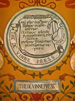 In 1865 De Vinne was a co-founder of the Typothetae, a trade organization of master printers, which was a predecessor of the Printing Industries of America.[20] He was also one of nine men who founded the Grolier Club in 1884,[21] and he was printer to the Club for the first two decades of its existence and designed and printed most of its publications during his lifetime.[22]