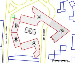 In the current classification, body A consists of the southern ear of the bastion and the southern wall of the retreat, body B consists of the one-story building with attic that closes the bastion to the west, body C consists of the northern wall of the retreat and the northern flank of the bastion to Hector Street, body D consists of the northern and southern flanks of the bastion east of Hector Street, and body E consists of the basement arrangement in the center of the bastion.[21]