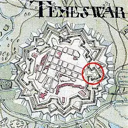 After the conquest in October 1716 of the Timișoara Fortress by the Habsburg army under the command of Eugene of Savoy, it was found that the Turkish fortifications could not cope with the new fighting techniques. As a result, the decision was made to restore the entire fortress. The fortification was done in the Pagan system.[3] The Pagan system inspired the first of the fortification systems envisaged by Vauban; the similarity between these systems spread the claim that Timișoara would have been fortified in the Vauban style.[4]