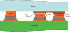 A thermal copper pillar bump, also known as a "thermal bump", is a thermoelectric device made from thin-film thermoelectric material embedded in flip chip interconnects (in particular copper pillar solder bumps) for use in electronics and optoelectronic packaging, including: flip chip packaging of CPU and GPU integrated circuits (chips), laser diodes, and semiconductor optical amplifiers (SOA). Unlike conventional solder bumps that provide an electrical path and a mechanical connection to the package, thermal bumps act as solid-state heat pumps and add thermal management functionality locally on the surface of a chip or to another electrical component. The diameter of a thermal bump is 238 μm and 60 μm high.