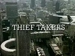 Thief Takers is a British television crime drama series, created by Roy Mitchell, and produced by Central Independent Television for the ITV network. The series depicts the work of a team of officers based in the Metropolitan Police Service's Flying Squad, which Reece Dinsdale, Brendan Coyle, Grant Masters and Nicholas Ball appearing in the principal roles. The series was Carlton's attempt to rival Thames Television's The Bill, after the producer unexpectedly retained the series despite a major take-over by Carlton.[1] A total of three series were broadcast between 1 February 1995 and 18 December 1997, with a total of twenty-five episodes broadcast. Each episode features a stand-alone case, with the exception of a small number of two-part episodes. However, the personal lives of each of the officers in the team provide the backdrop for a continuing story arc throughout all three series.