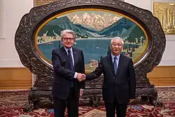 Thierry Breton (French pronunciation: [tjɛʁi bʁətɔ̃]; born 15 January 1955) is a French business executive, politician, and writer who served as European Commissioner for Internal Market in the first Von der Leyen Commission from 2019 to 2024. Breton was vice-chairman and CEO of Groupe Bull (1996–1997), chairman and CEO of Thomson-RCA (1997–2002) and chairman and CEO of France Télécom (2002–2005). In 2005 he entered politics, serving as Minister of Economy, Finance and Industry (2005–2007) in the governments of Prime Ministers Jean-Pierre Raffarin and Dominique de Villepin, during the presidency of Jacques Chirac. From 2007 to 2008 he was a professor at Harvard Business School, before joining group Atos from 2009 to 2019 as its CEO.[2]