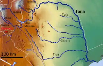 The Thika River originates in the Aberdare Range.[2] It flows to the Tana River, which empties into the Indian Ocean.[2]