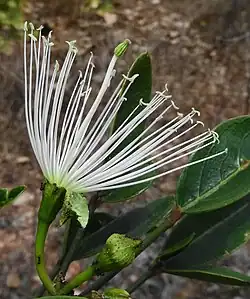 The species grows up to 7 meters tall with tuberous roots; branches are brown or grey and lenticellate.[4] Leaves: simple or 3-foliate; leaflets obovate to elliptic in outline and with a leathery surface, the leaflets are about 3-9 cm long and 1-5 cm wide, apex is obtuse to rounded while base is cuneate to rounded.[4] Inflorescence is terminal or axillary raceme like, white and green with spreading and wavy stamens.[5] Fruit is cucumber like in shape, ellipsoid and up to 6 cm long and contains numerous seeds.[4]