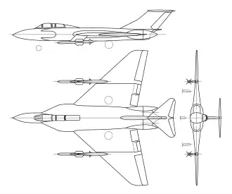 At a design conference on 12 May 1953 with Gloster, the Ministry stated that Gloster's primary aim of the work should be to improve the overall performance of the Javelin, not just the PR version. They wanted more engine power, the ability to carry more armament, and the improved Mk. 18 (AI.18) aircraft interception radar. Estimates suggested that the design would be able to reach Mach 1.2 to 1.3 in a dive when equipped with uprated Armstrong Siddeley Sapphire Sa.10 engines. This became the P.356 design of July 1953.[2] A further development was P.364 of September 1953, which moved from the 14,000 lbf (62,000 N) Sa.10 to the new 16,000 lbf (71,000 N) Bristol Olympus Ol.6 and featured a modified vertical stabilizer suggested by the Royal Aircraft Establishment.[1]