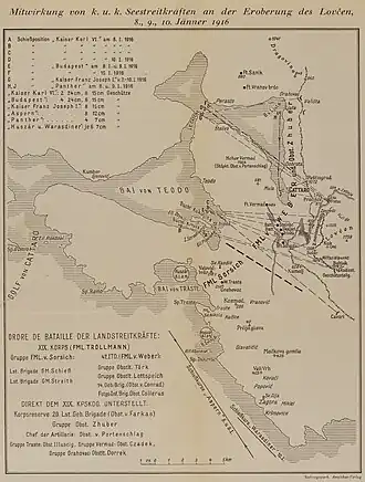 After the successful Campaign against Serbia in autumn 1915, the Austro-Hungarian High Command decided to invade Montenegro, where Serbians forces were retreating during their so-called Great Retreat. Two Austrian Army corps for this task were formed in December 1915. One in the west under command of Stjepan Sarkotić between Trebinje and Cattaro, composed of the XIX Army Corps (Armeenkorps), reinforced with troops from Bosnia-Herzegovina and Dalmatia. They were to attack the main body of the Montenegrin army, gathered around Mount Lovćen, supported by French artillery, and a second attack was planned from Trebinje towards the east.