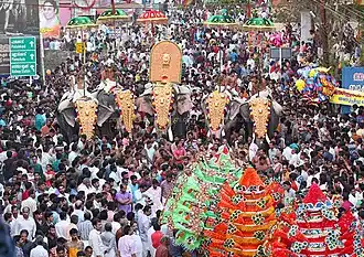 The festival lasts for 11 days from Makayiram star in Meenam (March, April).[5] There is evidence to prove that the pooram festival has a history going back to the early decades of the 16th century in the palm leaf records of Calicut University.[6] People from different parts of the State have started reaching Angadipuram to seek.[7]
