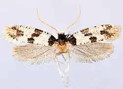 The wingspan is 13−15 mm for males male and 17 mm for females. The forewing ground color is bright white with a black triangular patch from the costal margin to the dorsum on the basal 1/6 and an oblique, black fascia from the basal 1/3 to just before the middle of the dorsum. There is also a rectangular black patch from the outer margin of the cell to the distal 1/6 of the forewing, confluent with two black subtriangular patches from the costa and termen before apex respectively, forming a broad Y-shaped pattern. Furthermore, there are two black costal spots between the oblique fascia and the Y-shaped pattern. The termen and dorsum are scattered with faint dark brown dots. The fringe is yellowish brown. The hindwings are light grayish brown with a gray fringe.