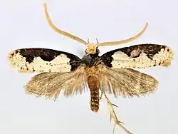 The wingspan is 18.5−20.5 for males. The forewing ground color is creamy white, with scattered dark brown scales on the distal ¼. There is a triangular black patch on the basal 1/5 and a broad black costal blotch narrowly confluent with the basal patch on the anterior margin, curved in a W shape on the posterior margin, its basal half apically rounded and reaching half width and the distal half triangularly crossing the midwing. There are two small indistinct spots along the costa before the apex. The termen and dorsum are scattered with faint dark brown dots. The fringe is light yellowish brown. The hindwings are cupreous brown and the fringe is grayish brown.