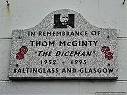 The poet Brendan Kennelly wrote a tribute to McGinty in the course of which he said, "Thom McGinty's magic has to do with his ability to mesmerise his audience, to lure them out of their busy city selves and to take them away into that land of perfect stillness where marvellous dreams are as normal as Bewley's sticky buns."[14] Actor Alan Stanford proposed in 2005 that Grafton Street should have a statue of the performer.[13] A song called "Diceman" was released by Rocky de Valera and the Gravediggers in 2007.[21] A plaque in memory of McGinty was unveiled at the Baltinglass courthouse during the Baltinglass Street Festival on 27 August 2010.[22][23] There is another plaque dedicated to him in Tralee, on the footpath in Denny Street at the corner of Castle Street where he performed during the Rose of Tralee festival.[24]