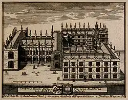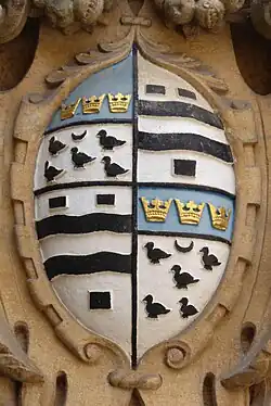 John's father, also John Bodley, was a younger son of the gentry family of Bodley of Dunscombe,[7] near Crediton[8] in Devon. Thomas's mother was Joan Hone, a daughter and co-heiress of Robert Hone of Ottery St Mary, Devon.[9] Thomas's younger brother was Sir Josias Bodley, knighted in Ireland by the Earl of Devon.[10]