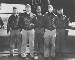 Doolittle Tokyo Raiders, Crew No. 9, 34th Bomb Squadron. From left to right: Lt. Thomas C. Griffin, navigator; Lt. Harold F. Watson, pilot; TSgt. Eldred V. Scott, gunner; Lt. James F. Parker, copilot; SSgt. Wayne M. Bissell, bombardier. On the deck of USS Hornet, April 18, 1942