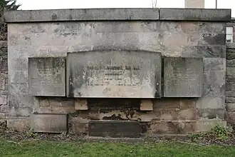 Chalmers was interred in the Grange Cemetery on 4 June, the very first burial in that cemetery.[21] His grave is on the north wall, near the north-west access. A large crowd of persons of all denominations accompanied his remains to the grave.[22] His wife Grace Pratt died 16 January 1850 and is buried with him, as is his daughter Grace Pratt Chalmers (1819–1851) and two of his other six daughters. James Sievewright, the moderator on the year he died, preached a eulogy.[23]