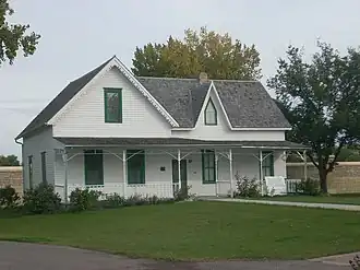 Built in 1879 for Thomas D. Campbell, the house consists of the original 1879 log cabin enclosed within a later Gothic Revival wood-frame addition, which is dated to ca. 1881–1900, with an overall L-shaped floor plan. The home has gabled roofs and clapboard siding. The main facade and south gables are distinguished by lace bargeboards, and the west gable contains a pointed window. A porch extends across the west facade and is supported by turned posts and bentwood arches. It is the only building remaining from the Campbell family's pioneer farmstead.