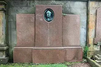 He died at home, 9 Ainslie Place[4] on the Moray Estate (formerly the home of James Ivory, Lord Ivory) in the West End of Edinburgh on 6 September 1896. He is buried with his parents in nearby Dean Cemetery. The monument was sculpted by John Hutchison.