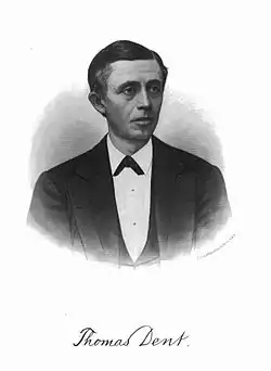 Dent was born in Hennepin, Illinois, the son of George Dent and Comfort (Ijams) Dent.[3][4] George Dent held a number of elective offices in Putnam County, including clerk of the circuit and county courts, county judge, and member of the Illinois House of Representatives in 1853 and 1864.[5] Thomas Dent was educated at public schools in Illinois and Ohio, and then, at age 15, became permanently employed as his father's assistant.