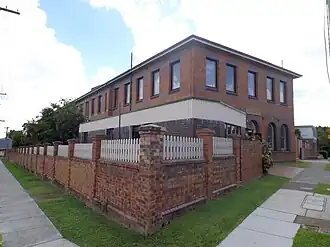The main building is located at the front of the site with the long axis following the Montague Road boundary. The foundations and ground floor are constructed of concrete which support load bearing walls of plain red machine-made bricks laid in English bond pattern. Attached buttresses are evenly spaced along the walls on the long axis, and sills, dressings and banding at the first floor and sill levels and are highlighted with dark blue salt glazed bricks. Two sets of new metal fire stairs are located on the eastern side of the building.[1]