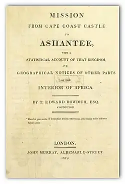 His widow, Sarah (Wallis) Bowdich Lee, published an account of his last journey, entitled Excursions in Madeira and Porto Santo . . . to which is added A Narrative of the Continuance of the Voyage to its Completion, &c (London, 1825). Bowdich's daughter, Mrs Tedlie Hutchison Hale, republished in 1873, with an introductory preface, her father's Mission from Cape Coast Castle to Ashantee.[4]