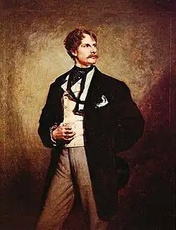 Anna, having now inherited the fortunes of two of her grandfathers, William Almy and Moses Brown, was described as the wealthiest woman in America. Three years after the fire, she married Thomas Frederick Hoppin (1816-1873), son of Thomas Coles Hoppin and Harriet Dunn (Jones) Hoppin. Hoppin was a painter, sculptor and engraver and a member of a prominent local family of diplomats, physicians, artists and architects which included his brother, illustrator Augustus Hoppin.[4] They soon initiated the design and construction of a new house on the site. To design their new house, they hired Boston artist and architect Alpheus C. Morse, who Thomas Hoppin persuaded to move to Providence. For the Hoppins, Morse designed an elaborate Italianate villa. To memorialize Anna's elder sister, who had last been seen at a window holding a pitcher, Morse and Hoppin included a statue of a young woman with a pitcher in a niche above the east-facing family entrance.[3]