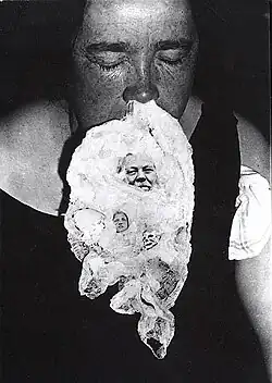 By 1928, Poole introduced the Hamilton family to two Scottish sisters-in-law, Mary Ann Marshall and Susan Marshall, also known as Dawn and Mercedes. These two women became regular mediums at the Hamiltons' "home circles".[17] The family would invite friends and members of the community to participate in their séances. Many of the persons who attended the home circles were also doctors and businessmen, such as the lawyer Isaac Pitblado and Rh blood specialist Bruce Chown.[18] The first table rappings and table tiltings of "Elizabeth M", as Poole was known, were followed by clairvoyance, trance states, automatic writing, visions, then the manifestations of materializations, wax molds, bell ringing, and finally in 1928, ectoplasm.[19] As a spiritualist, Hamilton believed ectoplasm to be materializations from the spirit world. He photographed the ectoplasm, and Lillian took notes of what occurred in the second-floor room in Hamilton House. Margaret also served as recording secretary for many of her father's experiments.[20] Skeptics investigating Hamilton's work have suggested that the ectoplasm shown in the photographs could be made of tissue paper and cut-out photographs of people.[21][22]