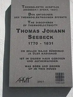 Seebeck was born in Reval (today Tallinn) to a wealthy Baltic German merchant family. He received a medical degree in 1802 from the University of Göttingen, but preferred to study physics. From 1821 to 1823, Seebeck performed a series of experiments trying to understand Ørsted's findings from 1820. During his experiments, he observed that a junction of dissimilar metals produces a deflexion on a magnetic needle (compass) when exposed to a temperature gradient. Because Ørsted had discovered that an electric current produces a deflexion on a compass transversal to the wire, Seebeck's results were interpreted as a thermoelectric effect.[2] This is now called the Peltier–Seebeck effect and is the basis of thermocouples and thermopiles.