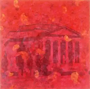 In 1983, Lawson began using photographic images of classical architecture and mountain landscapes that connoted institutionalized culture, power and mysticism, which he obscured with veils of painterly, scumbled brushstrokes (and later, dots, pills and paisleys).[55][60][61] Reviewers generally placed works such as Metropolis: The Museum (1983) or The Temple of the Kultur Critic (1984), among Lawson's most alluring, but differed on their political efficacy.[8][62][63][64][65] Ronald Jones wrote that Lawson successfully subverted cultural expressions of authority, "prov[ing] them too slight to thrive outside their incubated logic."[66][67][68][69][60] Eleanor Heartney, however, considered the architectural images less resistant to the seductions of the painting surfaces than earlier romantic imagery, as did Donald Kuspit, who felt the critique was vulnerable to absorption by the dominant culture.[8][64] In his 1987 show, "The Party's Over," his imagery and presentation, if not his intent, became more polymorphous. In paintings and an installation, he mixed expressions of freedom, waste and excess—aerial views of freeways, liquor-ad-like splashes, corporate urbanism and celebrity—with violent overlays of bright, exaggerated Expressionist brushstrokes and paint blobs to self-critically reveal them as empty gestures of power and unmediated artistic angst, petrified into formula.[55][70][58][61]