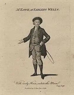 Lowe sang as a child: in May 1732 he sang in Handel's oratorio Esther at the King's Theatre. His career as a tenor is first known in August 1740, when he took part in the masque Alfred by Thomas Arne, at its first performance at Cliveden, country home of Frederick, Prince of Wales.[1] He first appeared at Theatre Royal, Drury Lane in London in September 1740, as Sir John Loverule in The Devil to Pay by Charles Coffey. During his first two seasons there he played Macheath in The Beggar's Opera, Bacchanal in Arne's Comus and Arne's songs in the incidental music for several productions.[2]